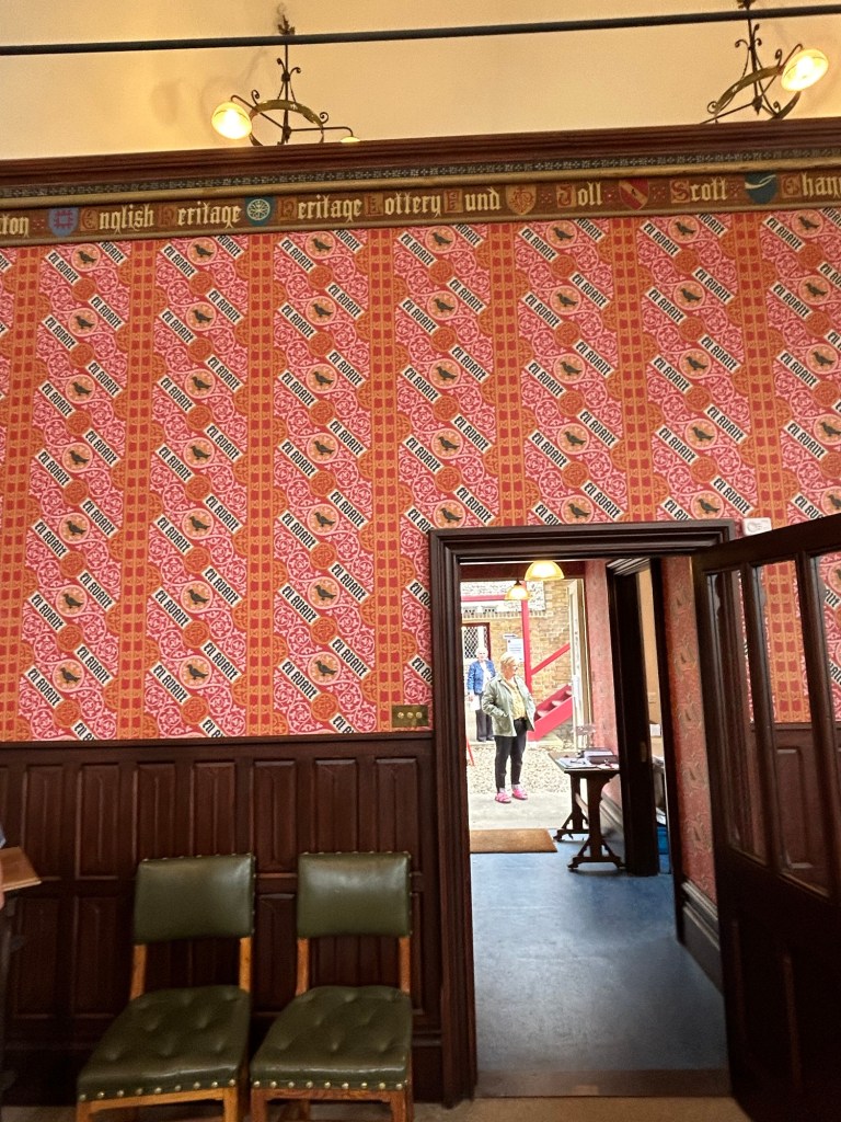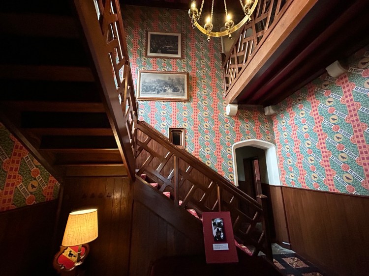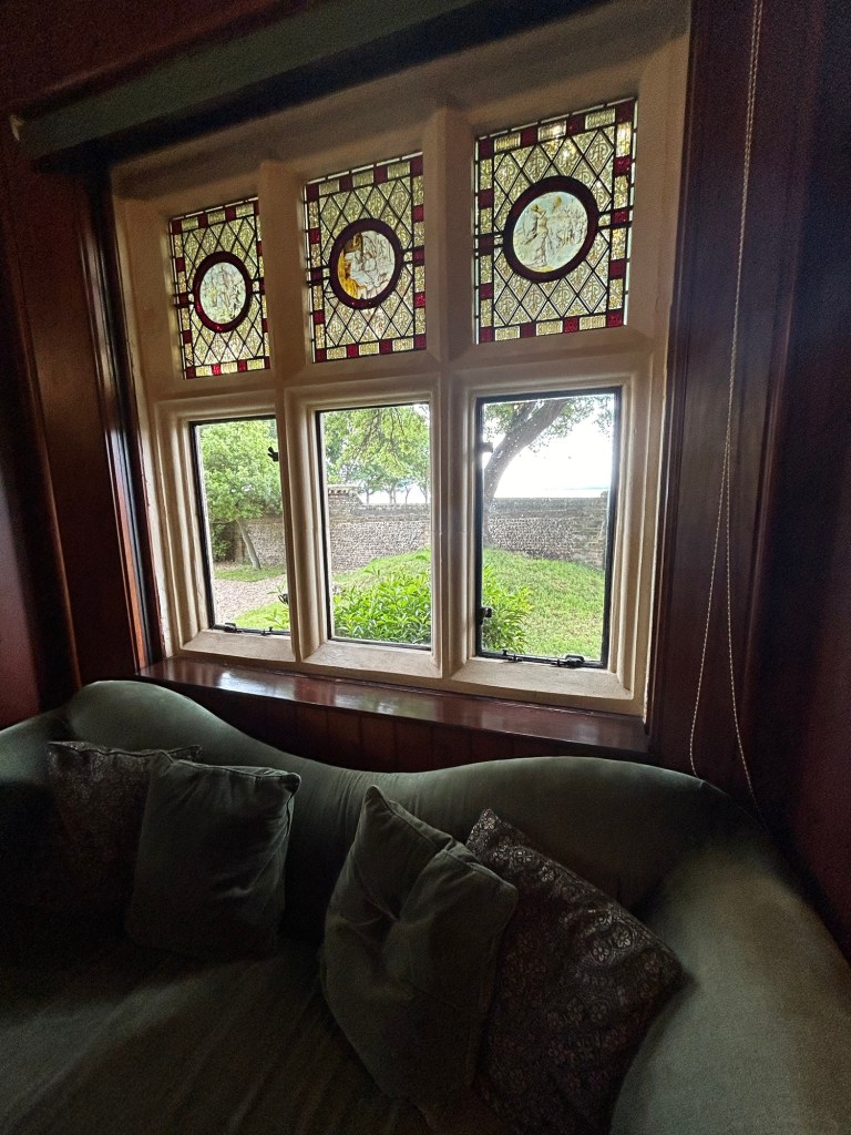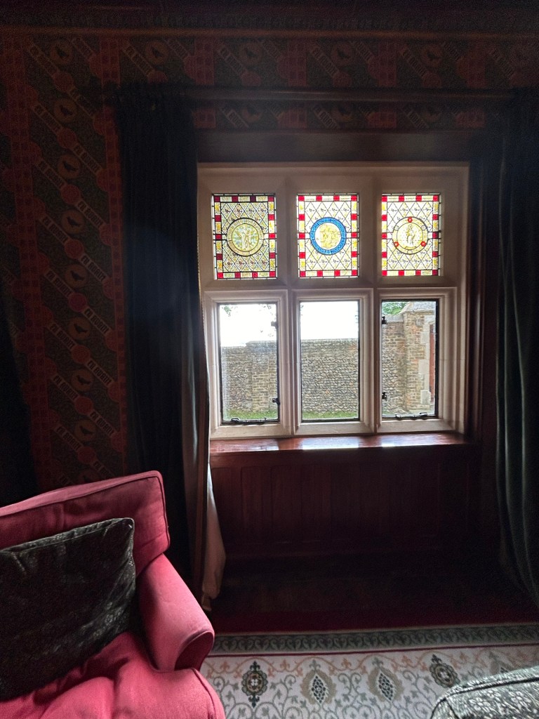 The house has several interesting features. Most evocative is the library, where Pugin completed much of his work. Rich with stained glass and matchboard panelling, it adjoins a private chapel built in 1840. The chapel door, designed by Pugin himself, is a particularly fine example of his architectural craftsmanship.In the hallway, En Avant wallpaper proudly displays Pugin’s family motto, setting the tone for the rest of the house. Floor tiles bearing his initials, AWP underfoot. The sitting room has an impressive stained glass window. It depicts saints. A fireplace is decorated with symbolic motifs. These represent each of his children.